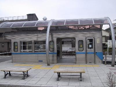 | 側面からです。 先頭部だけで後ろはカットされています。 公園のスペースも広いので、カットしなくてもよかったのでは ないかとちょっと残念です。しかしこうして見るといかにも ホームに停車しているようです。 |