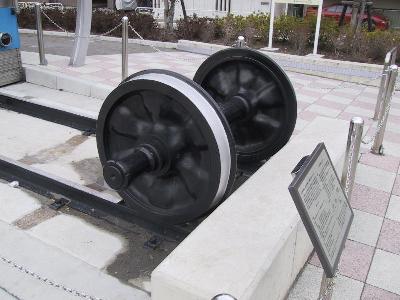 | この保存車両、台車は履いてませんが、実際に使われていた 車輪が前方に展示されています。 |