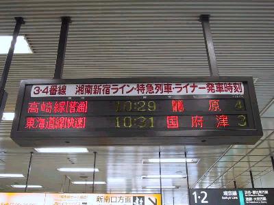 | 湘南新宿ラインは3番線、4番線から発車する。 | 番線案内の賑やかなこと... 3番、4番には恵比寿からの埼京線、湘南新宿ライン(高崎線、宇都宮線、 東海道線、横須賀線) そして成田エクスプレスが発着する。 |