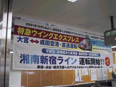 | 側面には新宿経由と緑地に白抜きで宇都宮の表示 | 宇都宮線久喜駅に掲げられた横断幕。 |