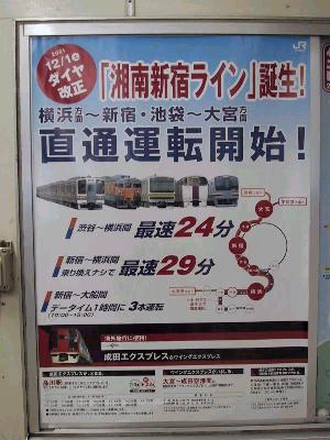 | 新宿駅に貼られたポスター 最初に「新宿〜横浜間」ではなく、「渋谷〜横浜間 最速24分」と書いてあるのは 東急東横線を意識しているのであろうか。 |