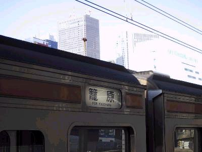 | 新宿の高層ビルをバックに高崎線直通列車が停車する | この電車は籠原行。バックは新宿西口の高層ビル |