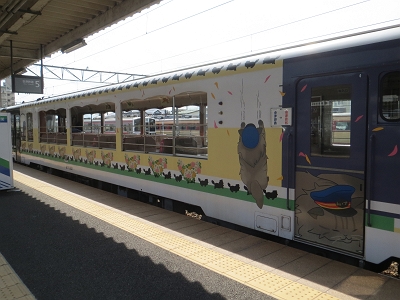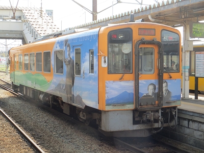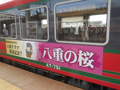 | 折り返しは普通列車になるためヘッドマークは外されました。 | 側面には八重の桜のラッピングがされていました。 |