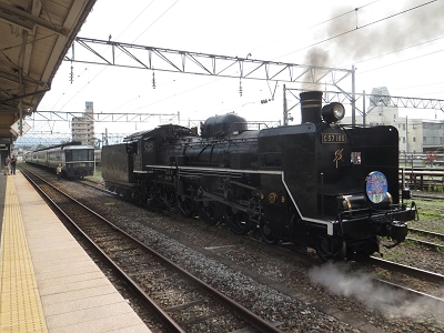 | 会津若松駅で出発を待つSLばんえつ物語号 | 8月のヘッドマーク |