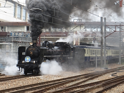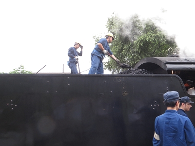 | 石炭を補充します。 | 展望グリーン車を目立つようにしたのでしょうけど、 やはり、色は揃えた方が編成がきれいですね。 |