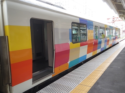 黒磯からは交流区間に入り、721系で郡山へ。郡山ではちょうど今日開催の郡山車両センター車両基地まつりが開催されていて、ちょっと行ってみることにする。(その様子は別途紹介します。)それに伴い、車両基地までの体験乗車号が運転されているので、撮影してみました。ホームへ行ってみると、あれ、ヘッドマークなしの単なるキハ112じゃん、って思ってたら、反対側はちゃんとヘッドマークがついていました。この列車は整理券が必要なので、残念ならが乗ることはできませんでしたが、写真を撮れただけでも満足です。