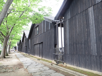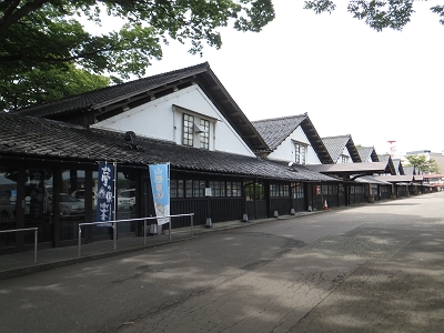 きらきらうえつはこの日は象潟行だったのですが、陸羽西線に乗るため酒田で下車。快速最上川まで1時間ほどあるので、酒田の町を少し散策。徒歩15分くらいのところに、山居倉庫があるので見学。北前船が通ってきた頃の米などの倉庫です。今は、観光施設として、土産物屋などが入っています。