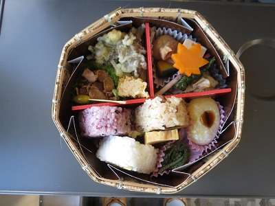 | 女将のおもてなし弁当 | 中身です。食べやすいようにご飯はおにぎりになっています。 |