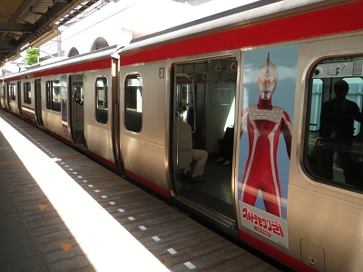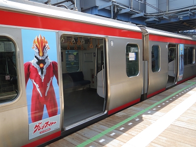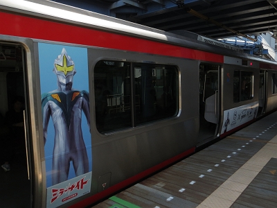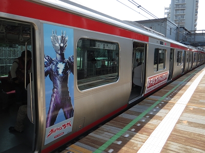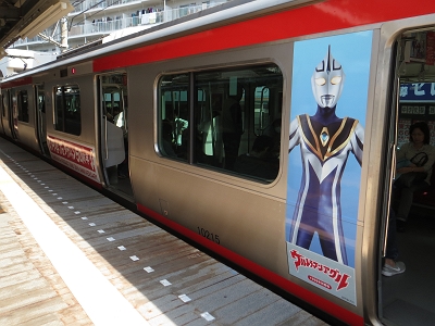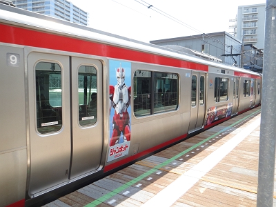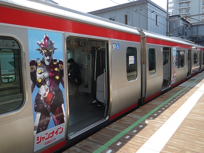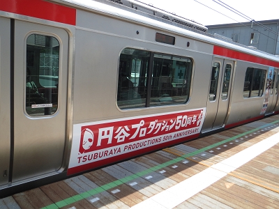 | 走るウルトラヒーロー号出発式 2013/04/27 横浜 | 9000系のあとに走るウルトラヒーロー号が入線してきます。 ウルトラマンがすでにスタンバイしています。 |