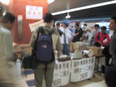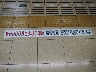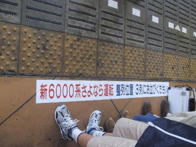 | 湘南台での乗車目標 | ホームでは折り返しの二俣川までの乗車券、硬券入場券、 6000系さよなら運転記念のパスネット、チョロQ、 下敷き、タオル等各種相鉄グッズの販売がありました。 |