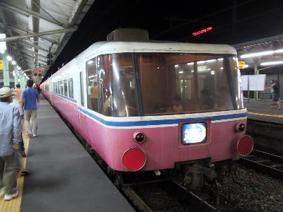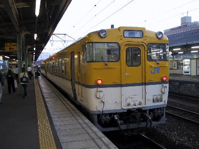 さて、さっぱりして、京都駅に戻ったら、それなりにいい時間になっていて、まもなく、本日のお宿のムーンライト山陽が入線してきた。この列車。ムーンライト高知とムーンライト松山と併結しているため、やたら長いが、ムーンライト山陽の部分は4両である。車輛はピンクと白の14系シュプール色。さすがに、夏休みで、18きっぷユーザーが大挙して乗るため満席なのだが、大阪を過ぎても、ちらほら空席が...どうも、不正に、2席分の指定席を取ってる人がいるらしい。まったく、どういう神経してるんだろう。あんたのおかげで、乗りたかった人が乗れないんだよ。この列車自由席もついてないんだから。(ここでやり口を書いてしまうと、悪用される可能性があるので、書きません。)JRもこういうのはしっかりと座席分の正規運賃を取るようにして、取り締まって欲しいものである。そして、もう1点。自分の隣に座ったのは女性。やっぱりさ、臨時列車でも、夜行列車なんだから、レディースカーとかレディースシート設けてよ。見ず知らずの男女が、一晩、隣同士の席っていうのは、気をつかっちゃうよ。痴漢に間違えられても困るしさ。と文句ばっかり言ってはいるが、このリクラ イニングシートものすごく倒れるので、すっごいよく眠れてしまった。翌朝、目がさめると、たらたらと電気機関車に引かれながら、山陽の穏やかな海沿いを走っていた。こういう瞬間が、夜行列車の魅力であり、またやめられない要因である。そういえば、こうして、客車列車に乗る機会もめっきり減ったよな。このモーター音もなく、発車するときの引っ張られる感じがなんともいえない。そんな列車を徳山で下車。初降りの駅である。