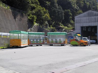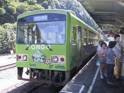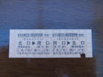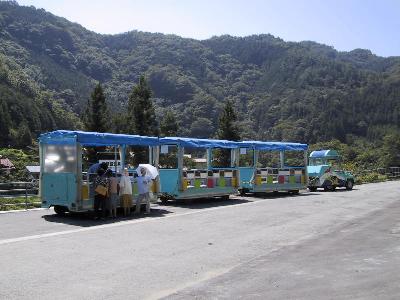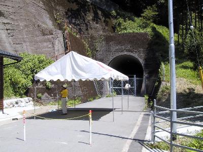 岩日北線はかつて、錦町から、山口線の日原までを結ぶ鉄道として建設されたが、1985年に国鉄改革から建設が中止されてしまった路線である。しかし、トンネルや路盤の大部分が完成しており、そのまま使い道もなく放置されていたものを、錦町が観光資源にと、無償譲渡を受け、岩日北線記念公園として雙津峡温泉(そうづきょう)までの約6kmを2001年に山口きらら博で使用されたきららトレインを使用して走行させるようになったものである。錦町のホームできららトレインの受け付けがあって、そこで予約した名前を告げ、乗車券を購入する。通常片道500円のところが、往復だと800円。さらに、錦川鉄道利用者は2割引の640円になるから安いものである。そしてなんと、この乗車券はD型の硬券である。きららトレインは電気自動車がゴムタイヤの3両の客車を引くのだが、厳密に言えば、トレインではなく自動車。ただ、ぱっと見は車輛が繋がっているのでトロッコ列車のように見える。早速乗り込むが、家族連れや、おばさんの集団がいるにはいたが、さすがに、お盆明けの月曜日ということで、席に余裕がある。発車時間になり、きららトレインはゆっくりと走り出し、 すぐに、全長1200mという長いトンネルに入った。時速は約8km、歩くのよりは速いが自転車よりは遅いという速度だ。ひとしきり、ガイド役のおばさん車掌が岩日北線の経緯などを案内をする。それにしても、盛夏というのに、なんとトンネル内のひんやりしていること。しばらくは真っ暗闇の中をひたすら突き進む。遠くに出口が見えてくるが、速度が遅いため、なかなか近づいてこない。そして、少しづつ出口に近づくにつれて天井のあたりをちらちらと黒い物体が舞っている。そう、コウモリである。かなりの数に少々驚くが、向こうもいきなりの列車の通過に驚いているのだろう。20年以上も誰一人通らず、彼らの家だったわけだからもっともである。
