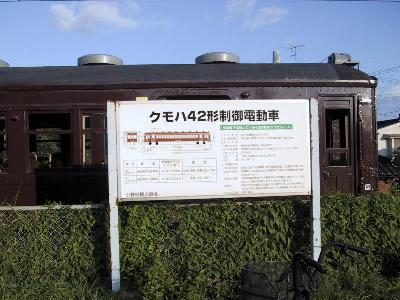 そして、運転士さんに、「今日はこの電車が走ってるんですね。やはり、夏休みだからですか?」と聞いてみると、意外にも、「毎日、走ってますよ。」との答え。驚いて、鉄道ファンに引退したと載っていたと話すと。「そんなことないですよ。毎日、定期で走ってます。点検とか、まあ、古い車両だから、時々MGの調子が悪いときなんかは123が入ることもあるけどね。」と話してくれた。まじ?こんな大変なこと、鉄道ファンともあろう雑誌が誤報かよ!ちょっと腹が立ちながらも、でも、誤報で良かったとの安堵の気持ちが交錯する。駅のところに、小野田市で立てたと思われるクモハ42の案内板がある。小野田市としては、観光資源にもなるのだろう。そんな貴重なものがそうやすやす無くなるわけないと思ったりした。家に帰ってから翌月の鉄道ファン9月号を確認すると、後ろの方に小さく訂正が載っていた。バカヤロー!!!。だいたいおかしいと思ったんだよね。この車輛が本当に引退するなら、もっと鉄道ファンが大騒ぎするよね。俺、全然、知らなかったもん。(笑)。しかし、ほどなくして、niftyの鉄道フォーラムのニュースで、来春引退の情報が流れた...今度の情報は本当か...。 もし、本当なら残念なニュースである。しばし、クモハ42と戯れたあと、再び、雀田に向かって動き出した。もう、最後かもしれない、吊り掛けサウンドを心ゆくまで楽しんだ。
