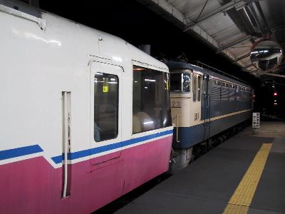 | 関門トンネル部分は交直流機EF81が牽引 下関駅 | ラウンジタイプ側の14系 |