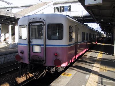 岩徳線って、地味な印象あるけど、実際、非電化で1時間に1本程度しかないんで、地味なんだけど、実は我々利用者にとっては重要な役割を持ってる路線なのだ。実は岩国−徳山間は、山陽本線経由より、岩徳線の方が距離が短い。よって、山陽線経由で乗車した場合でも、運賃は距離の短い、岩徳線経由で計算される。なんかあんまり関係ないって思われるかもしれないけど、そうでもない。例えば、東京から新幹線で博多へ行くときもこの岩徳線経由での距離で運賃が計算されているのである。もし、この岩徳線が廃線にでもなってしまったら、わずかではあるが、運賃が上がってしまうのだ。これで、少しは岩徳線の存在価値が分かってもらえたであろうか。能書きはこのくらいにして、これから、錦川鉄道に乗って、今年の7月7日に開通した岩日北線のきららトレインへと向かう。乗り継ぎ時間の関係で、川西ではなく、西岩国で錦川鉄道の列車を待つ。本当に、時間合わせのために、西岩国で下車したのだが、駅舎を見て驚いた。こじんまりとしながらも、大正浪漫漂う、洋風建築でとてもすばらしい。無人の改札口を出て、案内板を見ると、この西岩国駅が元の岩国駅だったとか...なるほど、 立派な駅舎のはずだ。思いもかけず、いいものを見せてもらい、ご機嫌で、錦川清流線に乗る。