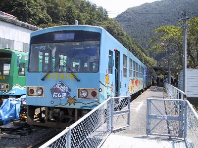 | 山深い温泉地に停車するきららトレイン | 錦町からは再び、錦側鉄道で岩国へ 1両づつ違ったカラフルな塗装が特徴 |
