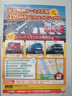 2013年5月5日、東京貨物ターミナル駅40周年記念フェスティバルが開催された。東京貨物ターミナルが公開されるのは、初めてのことで、EF65、EF66、などの機関車を始め、コンテナなどの展示もあった。