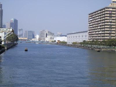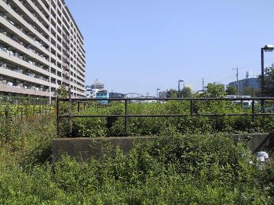 | 豊洲と枝川を隔てている豊洲運河にかかる朝凪橋から上流方面を 眺めると、貨物線の橋脚跡が残っています。 |