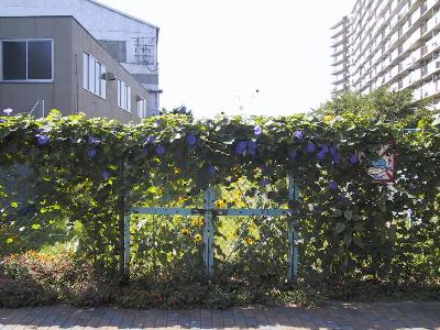 | 塩浜側に回ってみました。10月というのに、名残の朝顔が絡まって います。 |