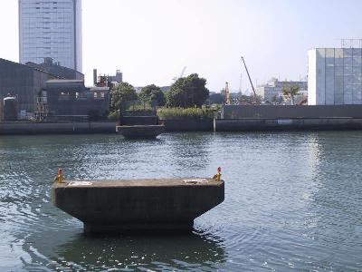 | 一番最初にみた豊洲運河に残る橋脚跡です。 こうしてみると、豊洲側に線路が続いていた様子がよく分かります。 |