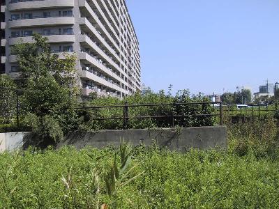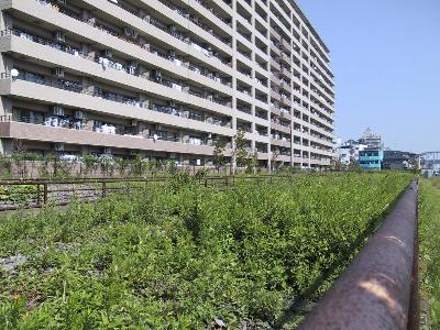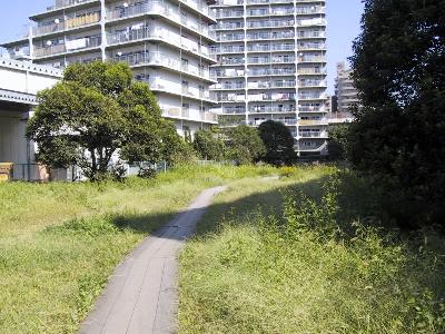 | ここも平行して駐車場あるので、中に入ってみました。 築堤に登って、豊洲方面を振り返りました。 |