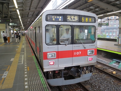| 東京メトロ03系124F 2012/08/14 多摩川 | 東急1000系1107F 2012/09/23 中目黒 日比谷線直通の表示も見納めです。 18m3ドア車の1000系は東横線での役目を終え、 池上線・多摩川線に転属または、他社への譲渡になると 思われます。 |