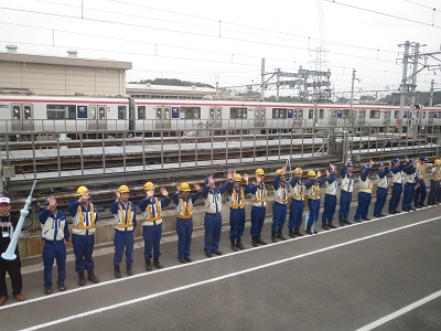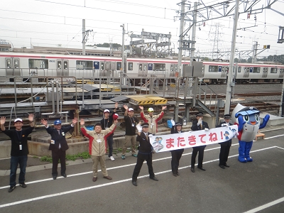 | 帰りの会場からの秋葉原行直通電車を見送る社員 | 横断幕でお見送りです。 |