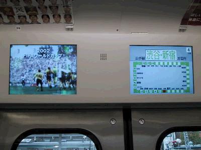 | 車内ではこれが目玉。各ドアの上に2箇所の液晶ディスプレイ 左は広告。右は案内版。さすがにこれは注目の的でした。 |