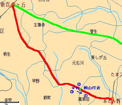 あざみ野駅から約1.5km地点の剣山付近。地図の番号は写真撮影の 場所を示す。 |