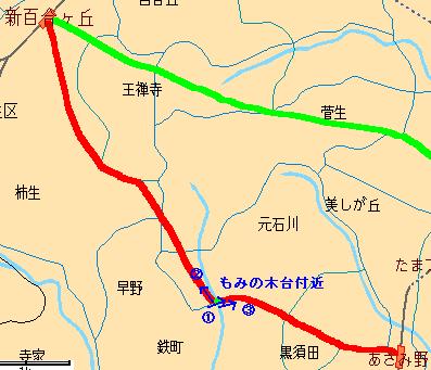 あざみ野駅から約2.3Km。もみの木台付近。 地図の番号は写真撮影の場所を示す。 |