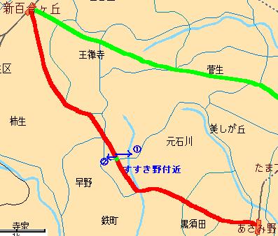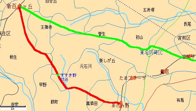赤線が3号線(あざみ野−新百合ヶ丘) の予想されるルートです。 緑の線ですが、こちらは、川崎市が構想中 の川崎縦貫高速鉄道の予想ルートです。 (これは、あくまでも私の予想です。 この通りになるわけではありません。) |