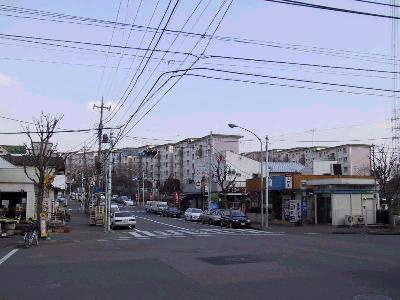 | @第一段階の終点駅ができると予想される「すすき野2丁目」交差点 後ろにはすすき野団地が見える。バスはこの先の団地のところが終点である。 |