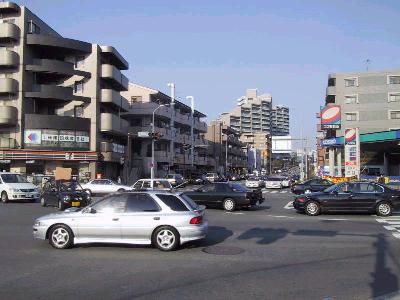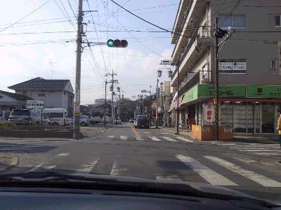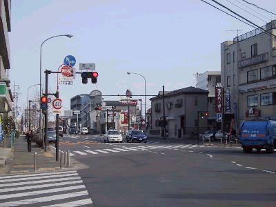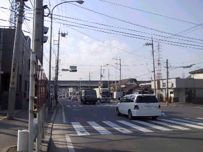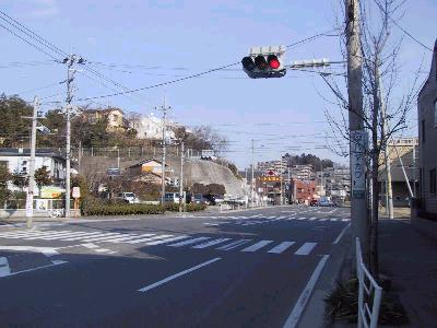 | 高田の交差点より日吉本町方面を望む。「たかた」と濁らない読みをする。 この少し先から道が狭くなる。 |