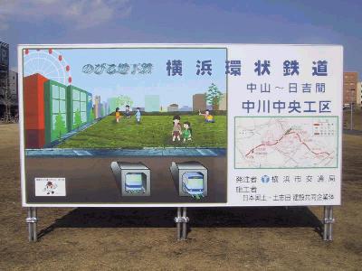 | センター北駅前に設置された「中川中央工区」の看板 | 通りゆく人も立ち止まって看板を見る。住民の関心も高いようだ。 |