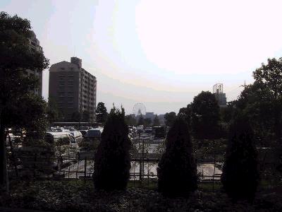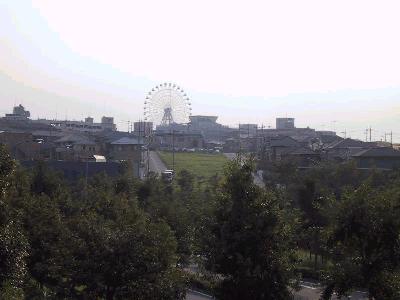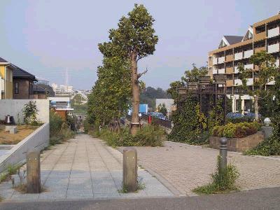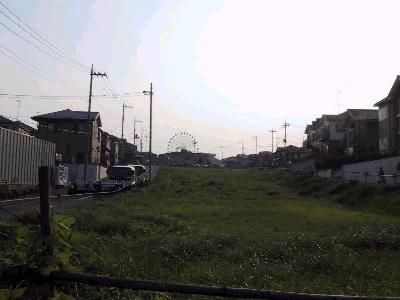 | 坂道を登り切ったところから、北山田方面を望みます。 | 左の地点から反対側をみます。公団住宅の駐車場になっています。 遠くにセンター北の観覧車が見えてます。 |