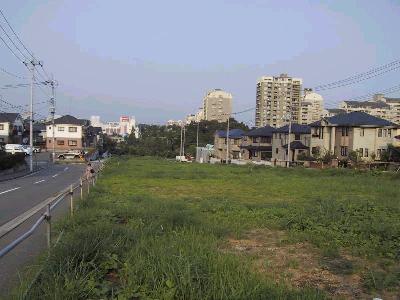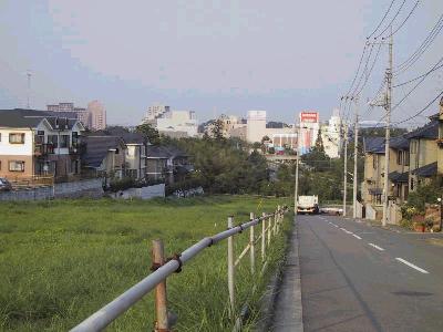 | 坂を登ったところで、北山田方面を望みます。 | 道路を跨いで、別角度から、ほぼ直線上に土地が確保されて いるのがよく分かる。 この地点からセンター北まではもう、徒歩で5、6分です。 |