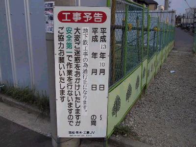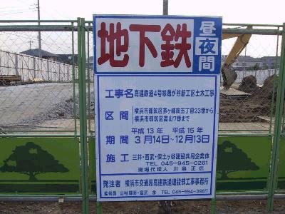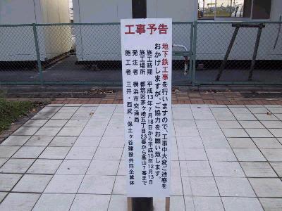 | 地下鉄工事を示す看板 | 中をのぞいてみます。川和町方面へ下り坂になっています。 |