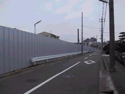 | 地下鉄工事のために、車線規制が行われています。 | 近くの歩道橋からみると、このように蛇行しています。 この蛇行部分に高山橋梁が架けられる予定です。 |