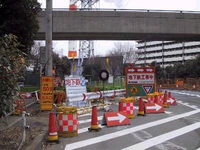 | ←センター南−葛が谷間→ 片側4車線のうち2車線が工事用地になっています。 この新横浜元石川線は地下で横切ります。 |