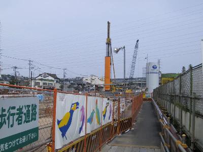 | 歩行者通路から日吉方面を望む | 背の高い重機が入ってます。 |