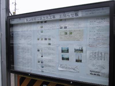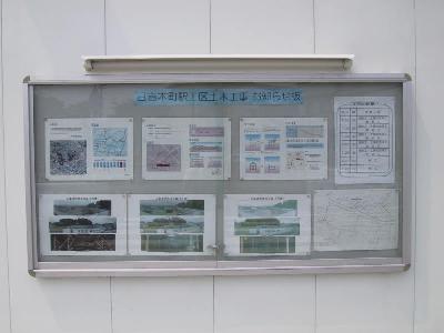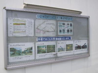 | 日吉駅本町工区 看板 正面から | お知らせ板 下記のとおり、さまざまな情報が掲示されています。 |
