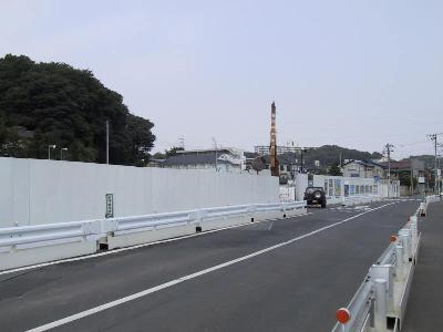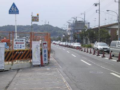 | 元石川線―日吉線の車道いっぱいに工事用地が設けられており、歩道は迂回路になる。 | |