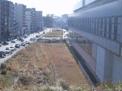 | ご覧の通り、すでに、土で覆われています。 | 反対側から眺めます。一見、まだ工事前のようですが、 地下にはすでにトンネルが完成しています。 |