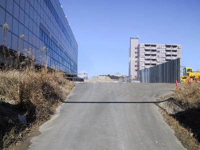 | センター南駅前の地点も鉄板からつぎはぎだらけのアスファルトになりました。 | センター南の裏手斜面、一部工事準備中です。 |