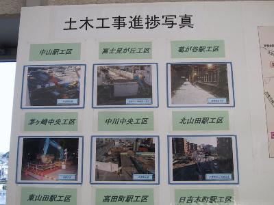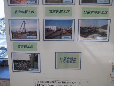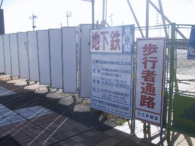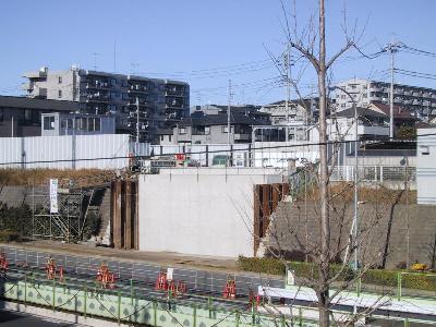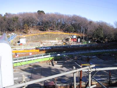 | さらに、道路を挟んで、川和町側を眺めます。 | この先、地下区間ながら地上での工事区間が続いています。 よく見ると、先の方にトンネルの入口が見えています。この坂を下ったところに、道路があって その手前から地上に出て、道路は高架橋で超えてその先でまた地下に潜ります。 というわけで、その先のトンネルの入口が見えているわけです。 完成すると、4号線では数少ない地上区間になります。 この日、お正月休みだったのですが、見回りの工事の人の話を聞くことが 出来ました。 |