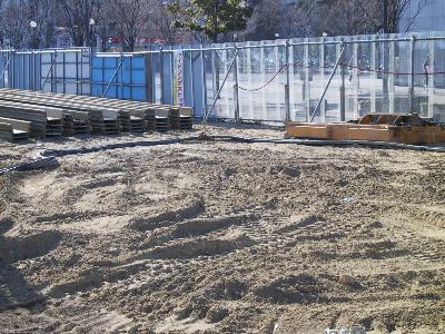 | センター北駅前広場です。 | 昨年12月26日に、この下の約96mの4号線最初のトンネルが 完成しました。現在は埋め戻し工事をしています。工事期間は今年の3月までに なっていますので、まもなく、この付近の工事は終了すると思われます。 |