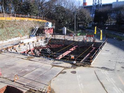 | まだ一部縦坑があいています。 これから、この下のトンネルから北山田までシールド機が進みます。 工事が早く済んだため従来、2機のシールド機で掘り進めるところを 1機で、北山田までを往復することができるため工事費の削減にも つながりました。 |