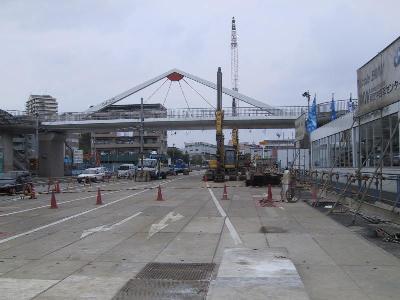 | 歩道橋に登って、駅になるところをみてみます。 | 歩道橋の上から見ると、車線規制の様子がよくわかります。 片側1車線づつの通行になっています。また去年は左側が工事用地 であったが、今は右側が工事用地になりました。 |