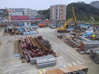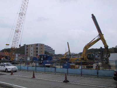 | 道路を挟んで反対側の駅になる場所です。 | ショベルカーが背の高いクレーンが入っています。 |