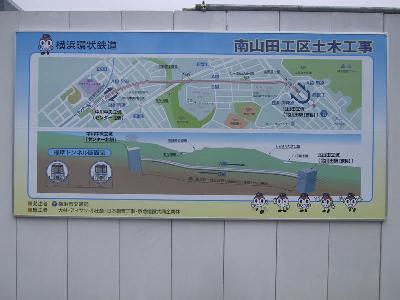 先ごろ4号線初のトンネルが完成した場所になります。 現在、地下ではシールドマシンが北山田駅に向けて進んでいます。 左上の図にもあるように工事が早く終わった関係で、1台のシールド マシンで上下線を往復することが可能になったため建設費が大幅な 削減できました。 左の写真はアクリル板から中を覗いてみました。ちょうど雨の日 だったので、水滴がついて見難くくてすみません。 中はすでに、工事が終了しており、すでに、草も生えてきています。 (この取材のみ翌日の23日におこなっています。) |